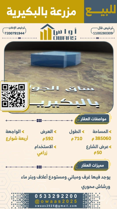 يوجد فيها غرف ومباني ومستودع أعلاف وبئر ماء ورشاش محوري